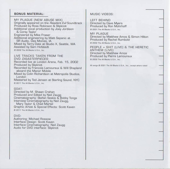 При создании этого альбомы приняло большое количество человек. Если вы интересуетесь творчесвом группы Slipknot, то на нашем сайте вы сможете найти больше информации о ней. Купить их CD диски очень просто.
