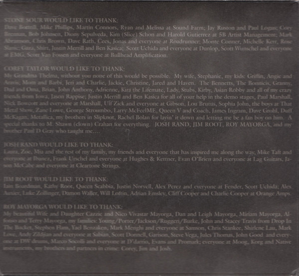 При создании этого альбомы приняло большое количество человек. Если вы интересуетесь творчесвом группы Stone Sour, то на нашем сайте вы сможете найти больше информации о ней. Купить их CD диски очень просто.