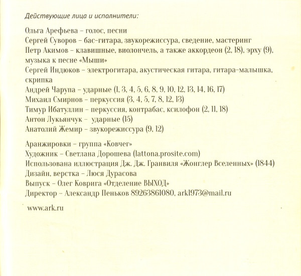 При создании этого альбомы приняло большое количество человек. Если вы интересуетесь творчесвом группы Ольга Арефьева, то на нашем сайте вы сможете найти больше информации о ней. Купить их CD диски очень просто.