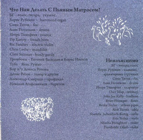 При создании этого альбомы приняло большое количество человек. Если вы интересуетесь творчесвом группы Аквариум, то на нашем сайте вы сможете найти больше информации о ней. Купить их CD диски очень просто.