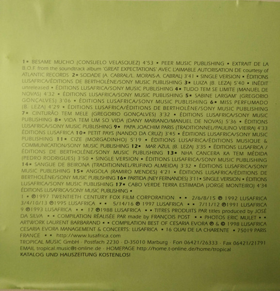 Если вы интересуетесь творчесвом группы Cesaria Evora, то на нашем сайте вы сможете найти больше информации о ней. Купить их CD диски очень просто.