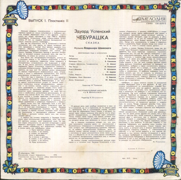 Эдуард Успенский - Чебурашка виниловая пластинка купить в Москве. Конверт NM. Пластинка Ex. Винил, Vinyl (LP)