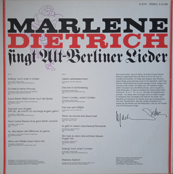 Marlene Dietrich - Marlene Dietrich Singt Alt-Berliner Lieder ( German Democratic Republic (GDR) / 1982 / Ex / Ex )