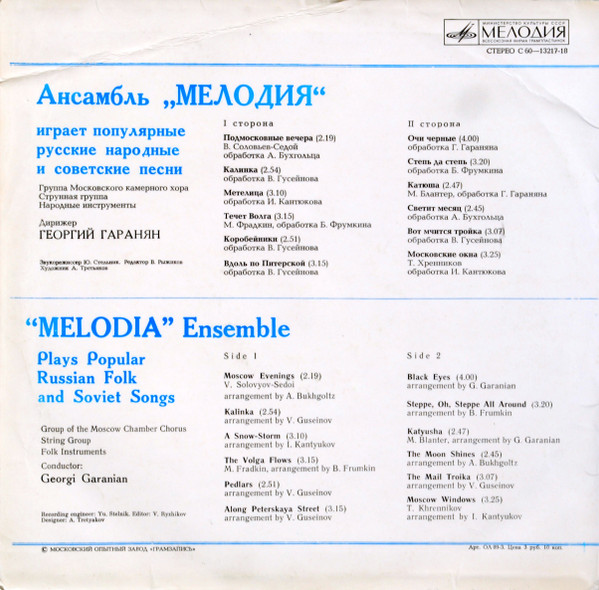 Мелодия - Plays Popular Russian Folk And Soviet Songs = Ансамбль "Мелодия" играет популярные русские народные и советские песни виниловая пластинка купить в Москве. Конверт NM. Пластинка NM. Винил, Vinyl (LP)