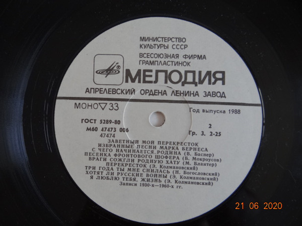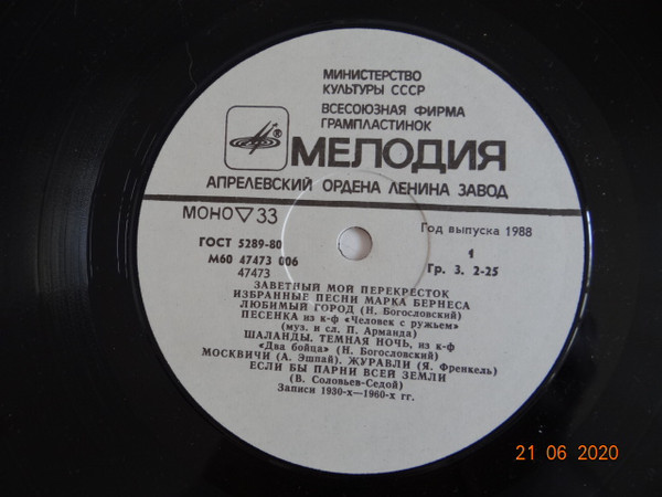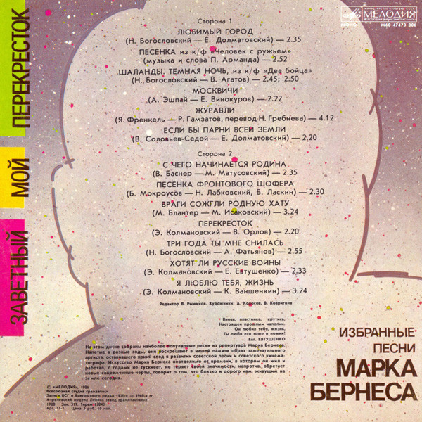 Марк Бернес - Заветный Мой Перекресток (Избранные Песни Марка Бернеса) ( USSR / 1988 / NM / NM )