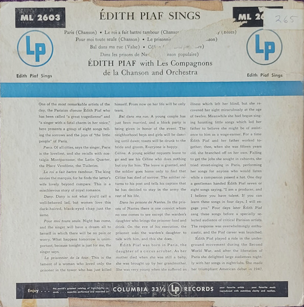 Edith Piaf - Edith Piaf Sings ( US / 1950 / VG+ / VG+ )