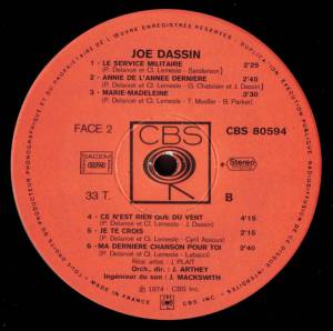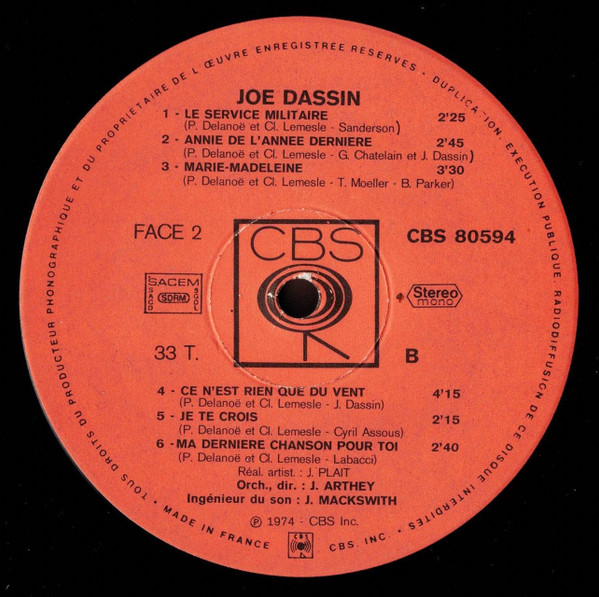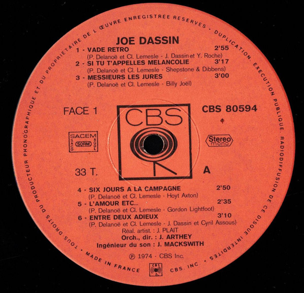 Виниловая пластинка Joe Dassin - Joe Dassin была выпущена в 1974 году. Треклист пластинки состоит из 12 песен. Для ознакомительных целей на сайте присутствуют видео ролики с примерами композиций исполнителя. По предварительной оценке можно сказать, что пластинка в довольно хорошем состоянии. Обложка винила в довольно хорошем состоянии. Эта пластинка считается оригиналом.Треклист