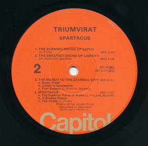 Виниловая пластинка Triumvirat - Spartacus была выпущена в 1975 году. Треклист пластинки насчитывает 9 композиций. Для ознакомительных целей на сайте присутствуют видео ролики с примерами композиций исполнителя. По предварительной оценке можно сказать, что пластинка в отличном состоянии. Обложка винила в очень хорошем состоянии. Данная виниловая пластинка может считается оригиналом.Треклист
