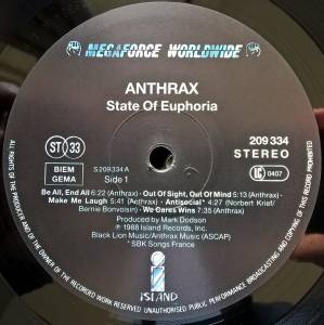 Купить винил Anthrax - State Of Euphoria в Москве с доставкой по России. Состояние конверта Near Mint. Состояние пластинки Excellent. Виниловая пластинка по отличной цене производства Europe