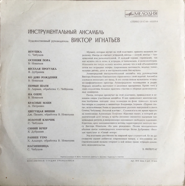 Инструментальный Ансамбль Под Руководством Виктора Игнатьева - Инструментальный Ансамбль Под Руководством Виктора Игнатьева виниловая пластинка купить в Москве. Конверт NM-. Пластинка NM. Винил, Vinyl (LP)