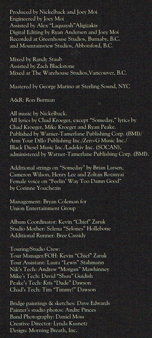 При создании этого альбомы приняло большое количество человек. Если вы интересуетесь творчесвом группы Nickelback, то на нашем сайте вы сможете найти больше информации о ней. Купить их Виниловые пластинки очень просто.